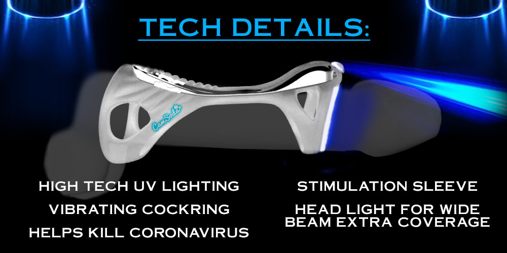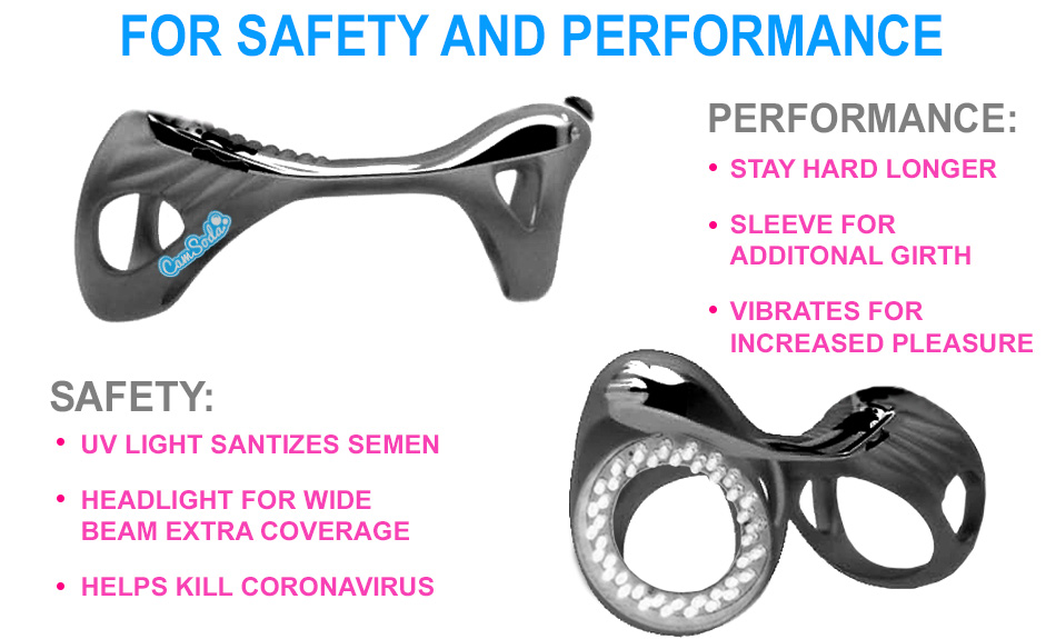 The Camsoda Semen Zapper is designed to help you stay super hard! It is a combination cock ring and penis sleeve, which increases girth and vibrates for maximum pleasure. Users wear The Semen Zapper as they would a penis ring and/or penis sleeve. They affix it to the base of their shaft and stick their member through it. The head of their member protrudes from the side of The Camsoda Semen Zapper that has an ultraviolet emitting light fixture. It zaps the semen as soon it comes out, killing the corona virus, whether the user is masturbating or engaging in sexual intercourse.